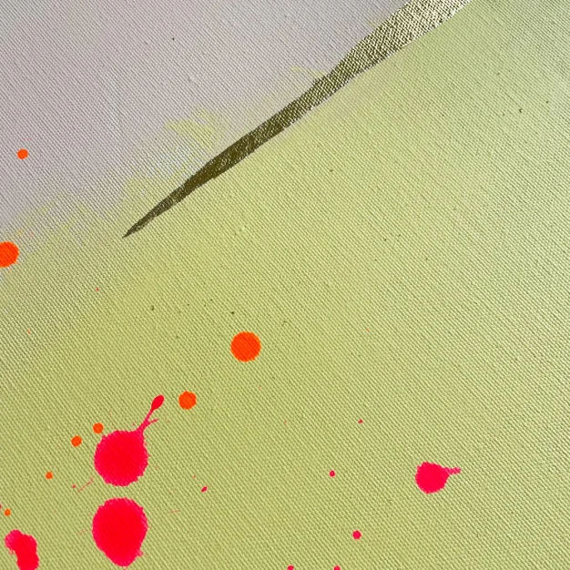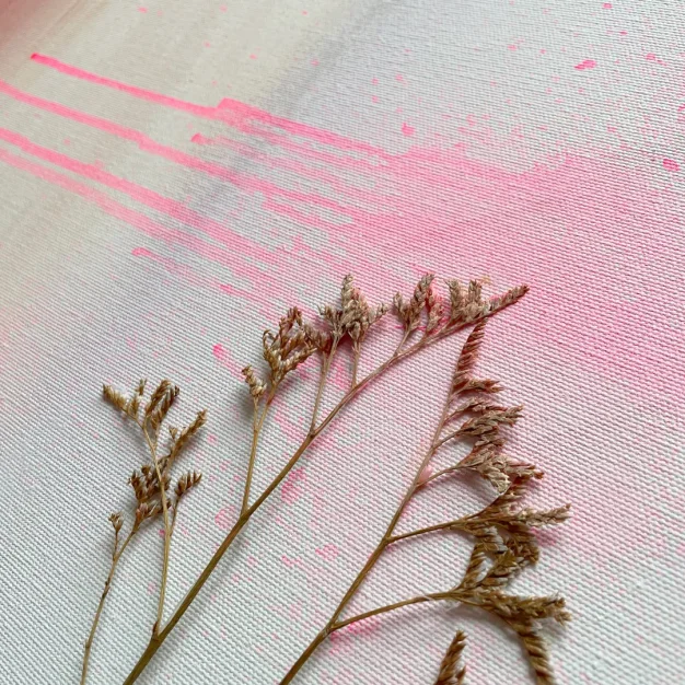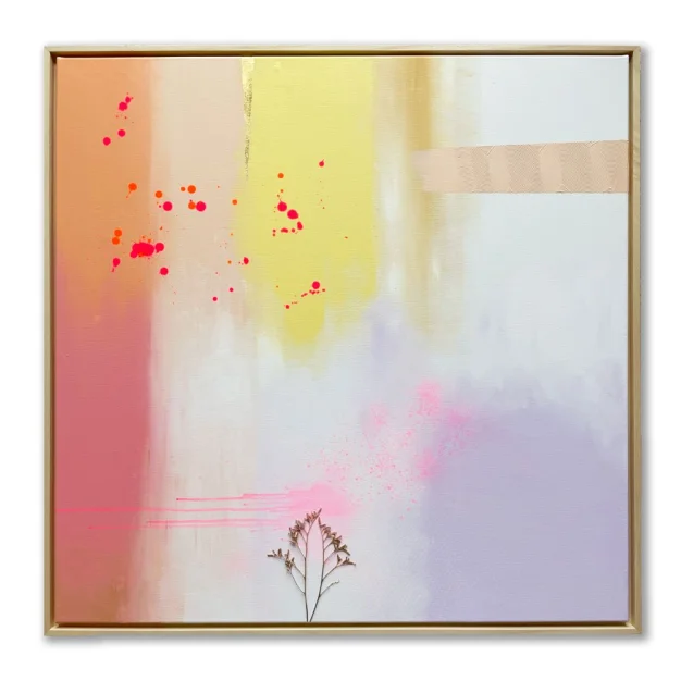 ‘Floria’ (Florish) ist ein abstraktes Gemälde, inspiriert von der Karibik, hergestellt mit Acrylfarbe, Neonfarbe und getrockneten Blumen. Dieses Kunstwerk kombiniert lebendige Farben und natürliche Texturen, um jedem Raum ein tropisches Flair zu verleihen.